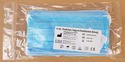 10-Pack Mundschutz 3-lagig Einweg-Maske Mund-Nase Gesichtsschutz mit Filter-Vlies und Ohrschlaufen