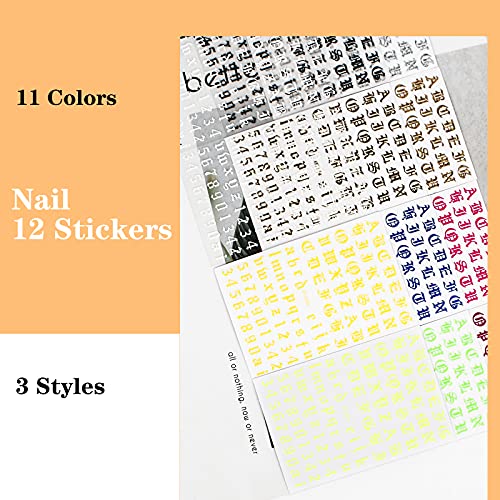 – Kombination: 12 Blatt Buchstabenfolge Nagelaufkleber(schwarz * 1, weiß * 2, pink * 1, blau * 1, gold * 2, silber * 1, grün * 1, orange * 1, lila * 1, fluoreszierendes Grün * 1)
