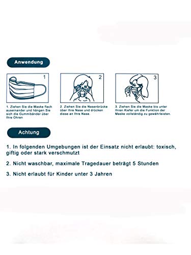 50 Einwegmasken in einer Schachtel. Farbe: Blau. Maskengröße: 17,5 cm x 9 cm, normale Erwachsenengröße, Unisex.