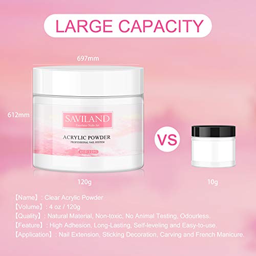 ❤【HOHE KAPAZITÄT & GELD SPAREN】 Saviland klares Acrylpulver mit großer Kapazität ist bis zu 120 g erhältlich, das mit feinem Puder die Gesamtheit weicher Pastellkreide oder Glitzer gemischt werden kann, um charmantere Acrylnägel zu basteln. Klares Acrylpolymerpulver eignet sich wunderbar anstelle französische Nägel, Acrylnägel, geschnitzte Blumen, Nagelverlängerungen und Nageldekoration.