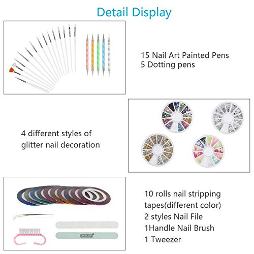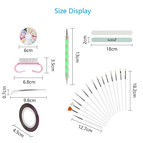 Gute Geschenke: 15*Nägel Pinsel, 5*Dotting Pen, 4 Räder*Nagel Kristalle Glitter Strass, 10*Streifenband, 1*Nagelfeile Zebra, 1*Polierfeile, 1*Nagelbürste(Zufällige Farbe), 1*Pinzette. Dies ist ein komplettes Set, ein großartiges Geschenk für jeden Nagelliebhaber.