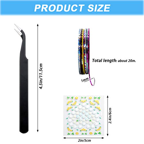 Verpackungsinhalt: 60 x Blätter 3D-Nailart-Aufkleber (weiße Blumen, schwarze Blumen und bunte Blumen), 10 x Nail Art-Streifenbänder in gemischten Farben, 1 x antistatische Pinzette. Kommt mit Schleifen, Schmetterlingen, Herzen, Blumen, Sternen und verschiedene Designs, könnten perfekte und attraktive Nageldesigns erstellen.
