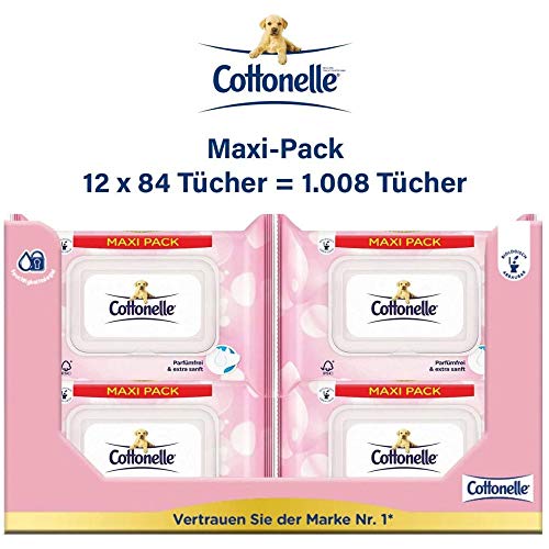 Lieferumfang: 1 x Cottonelle Feuchte Toilettentücher Maxi Pöbel, Sensitive Pflegend – Parfümfrei; Inhalt: 12 Packungen à 84 Tücher – 1008 Tücher; FSC-zertifiziert; Art.-Nr. 4554202