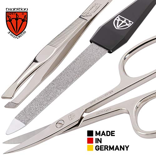 STAHLINSTRUMENTE NAGELETUI: Erstklassige geprüfte Drei Schwerter-Markenqualität seit 1927, glanzvernickelt und poliert – Made in Solingen | Unsere diffizil geschmiedeten Scheren und Zangen Made in Germany sind echt verschraubt und genügen höchsten Ansprüchen. Umfangreiche Qualitäts – Kontrollen garantieren eine lange Konstanz des Nagelsets.