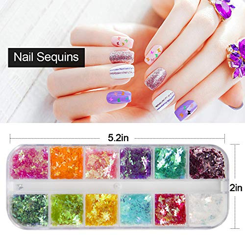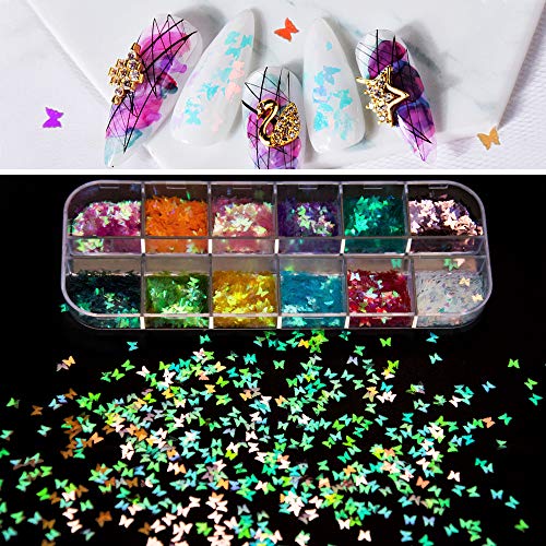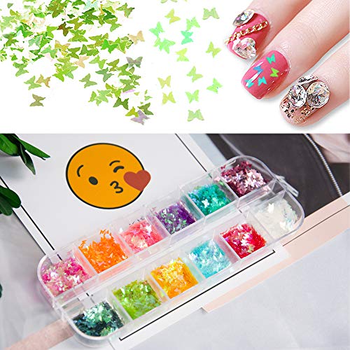 Schmetterlingsnagel-Pailletten – kommen mit 12 Gläsern in 1 Satz, 12 verschiedenen Farben. Jedes Muster wird in einem Glas mit guter Versiegelung geliefert, um es vor dem Auslaufen zu schützen. Das perfekte Geschenk für Ihre Freunde oder Freundin.
