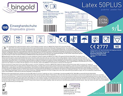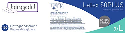 Bei diesem Ware handelt es sich um die robusten puderfreien polymerbeschichteten BINGOLD Latex 50PLUS Einmalhandschuhe. Dieser BINGOLD Aidshandschuh bietet Abschirmung wider Säuren, Basen, Alkoholen ebenso Ketonen.