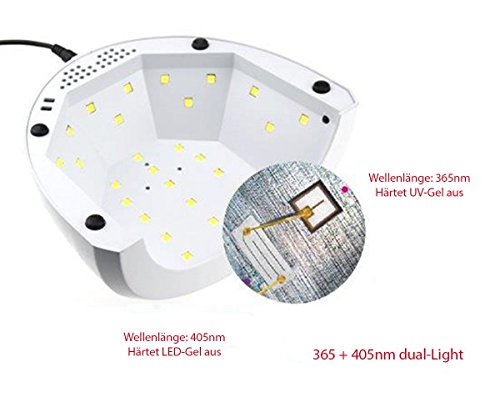 Stylisches Design im Pearleffekt 30 High-Quality UV-LED´s Besitzt 3 Einstellungsmöglichkeiten (5, 30, 60 Sekunden) und eine „Autostart-Sensor“ Kurvenblatt für 120 Sek. Lebensdauer von bis zu 50.000 Stunden Abnehmbare Bodenplatte zur besseren Reinigung oder zur Linderung bei der Fußmodellage Bodenplatte ist mit einem Magnetverschluss versehen Platzsparend, perfekt für mobile Tätigkeiten im Rahmen Aus Emmi-Nail UV-Gele, UV-Lacke und die LED-High Speed Nachfolge härten ab 5 Sekunden alle (für sonstige Gele adoptieren wir keine Haftung) Je nach Art und Beschaffenheit ist eine Kompletthärtung nach 30 oder 60 Sekunden gewährleistet 5 Sekunden zum Freezen des Gels, dann verläuft das Gel nicht mehr und kann gepincht werden Bewirkt in Kombination mit dem High Gloss Cleaner einen hervorragenden Glanz bei Versiegelungsgelen Technische Daten: Dimension: 150 x 200 x 85mm Zeiteinstellung: 5 / 30 / 60 Sek. „Autostart-Sensor“ für 120 Sek. Stromversorgung: 230V 50/60Hz Leistung: 30 High-Qualität UV-LED´s 365 – 405 nm (UV/LED) Schutzklasse: IP20 (Warnsymbol) Leistung: 36 Watt