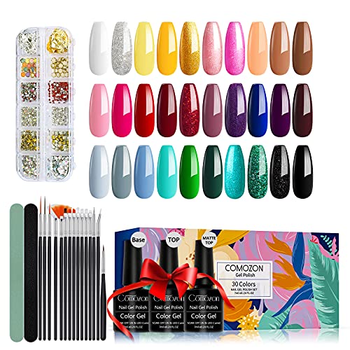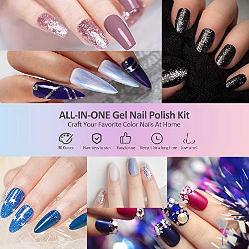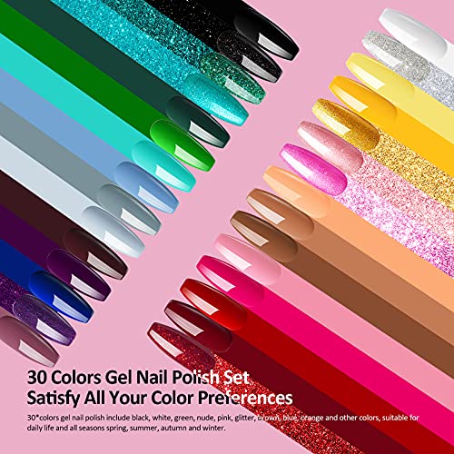 🌹🌷 【2021ALL-IN-ONE GEL NAGELLACK KIT, NAIL ART MIT NACH HAUSE NEHMEN】💐30 Farbgel Für GelnäGel: Schwarz, Weiß, Grün, Nude, Pink, Glitzer, Braun, Blau, Rot und andere GelnäGel Farben um alle Ihre Farbwünsche zu erfüllen, geeignet für das tägliche Leben und alle Jahreszeiten Frühling, Sommer, Herbst und Winter. Es enthält auch 1*Grundierung 1* Decklack,2* Reibstreifen, mit denen Sie schöne Nagelstile erstellen können,12* Arten von Strasssteinen,15*Nagelbürsten.