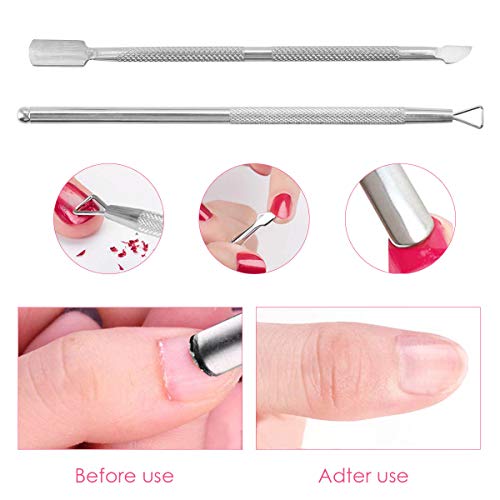 Edelstahlschieber: Kommt mit 2 verschiedenen Nagelhautschiebern. Eines ist ein Dreieck, das zum Herumlungern von Kristallnägeln und Nagelflicken verwendet wird. Beide sind strapazierfähig, der andere ist doppelt, um die meisten Teile von Fingernägeln und abgestorbenen Haut zu reinigen.