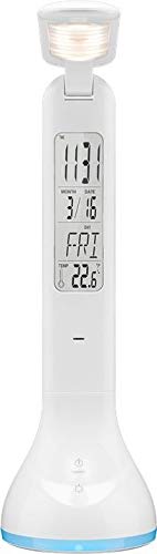 Akkubetriebene LED Tischlampe im trendigen Design mit RGB Stimmungslicht, Kalender, Uhr und Temperaturanzeige. Eine Notruf-, Timer- und Schlummerfunktion konvertieren diese zusätzlich