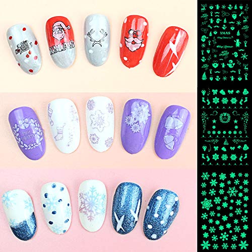 10 Blätter 900+ Motive mit bunten selbstklebenden Weihnachts nagelaufkleber-Abziehbildern. umfasst Weihnachtsmann-Glöckchen, Schneeflocke-Elch, Weihnachtsbaum-Pinguin und so weiter. Hinweis: Benötigt einige Minuten der Aktivierung durch Licht, bevor sie im Dunkeln leuchten.