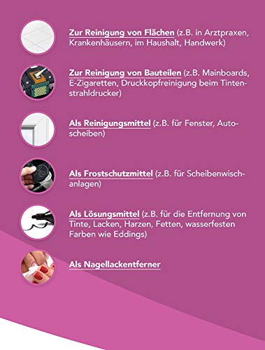 ✔ OHNE ZUSÄTZE – Isopropanol (IPA) besteht zu 99,9% aus Isopropylalkohol und beinhaltet keine Zusätze von Farb- oder Duftstoffen. Dadurch verdampft es rückstandsfrei und hinterlässt keine unangenehmen Gerüche.