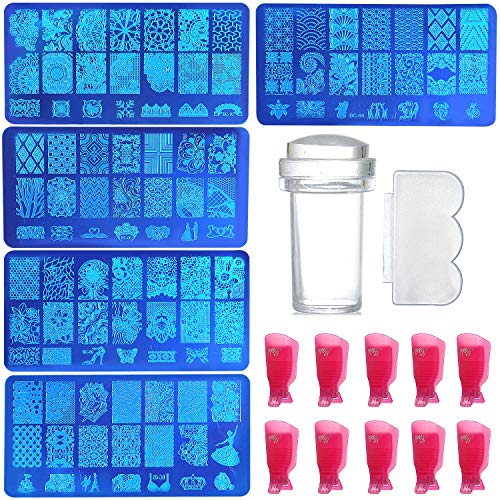 ✿ Das Paket beinhaltet 5 Fetzen Nail Stamping Plates + 1 Stampfer + 1 Schaber + 10 Acryl Nail Art UV Gel Clip
