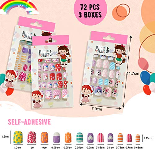 72 Stücke Kinder falsche Nägel drücken auf künstliche Nagelspitze kurze volle Verdeckung gefälschten Fingernagel in 5 Box mit Stern Kuchen Regenbogen Glitter Gradientenmuster für Mädchen Kinder Nagelkunst Dekoration
