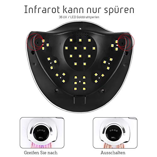 Schnelles Frottieren und Langlebig, Zäh – UV- / LED-Gel für Nägel mit unserer 120W UV Lampe für Nägel zu Frottieren nimmt demgegenüber 10 Sek. Und abbreviieren Sie Ihre Aushärtezeit um 70% im Vereinbarung zu herkömmlichen Nagellampen. Ausgestattet mit 36 Glühlampen mit Weißlichttechnologie mit doppelter Wellenlänge von 365-405nm, die Augen und Haut nicht schädigt, bis zu 5 Jahre Dauerbetrieb.