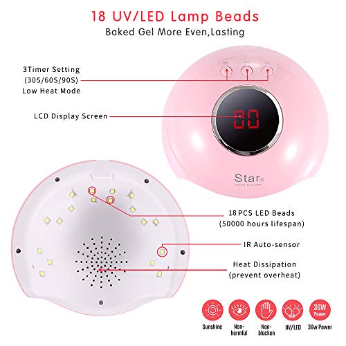 💗 Zäh und Effizient Abfrottieren:UV nagellampe ausgestattet 18 Glühlampen mit Weißlichttechnologie , die Augen und Haut nicht schädigt. 36 Watt Leistung und schnell trocknbar, Sie müssen Ihre Zeit nicht damit verschwenden, auf den trockenen Nagel zu warten.