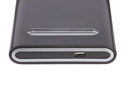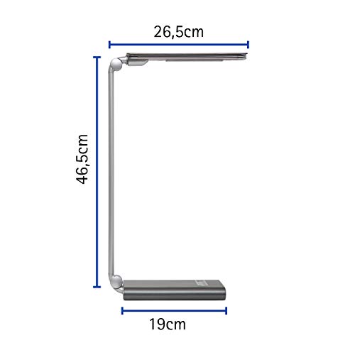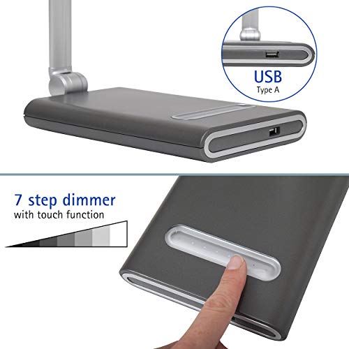 Clever: Beleuchtung im Fuß zeigt in eingeschaltetem Zustand die DimmstufeExtrem sparsam: 80 % abzüglich Energieverbrauch der LED im Abmachung zu einer GlühlampeEdel: Arm und Leuchtenkopf ganz AluminiumMit integriertem 5V, max.500 mA USB-Anschluss zum Aufladen von Tablets oder SmartphonesTechnisches Sicherheitskonzept Made by MAUL7-Abstufen-Dimmer mit Touchfeld-Bedienung am Leuchtenfuß30 Hochleistungs-LEDs (SMD-LEDs), 6500 Kelvin, tageslichtweißLeuchte enthält eingebaute LED-Lampen. Die Lampen können nicht ausgetauscht werden20.000 Stunden Lebensdauer der LEDsEnergieeffizienzklasse „A“Extrem niedriger Energieverbrauch mit ca. 9 WattGewichteter Energieverbrauch 8 kWh/1000h1800 Lux Beleuchtungsstärke bei 35 cm Leerzeichen, Lichtstrom 430 LumenArmlänge 41 cmHöhe in normaler Arbeitsstellung ca. 40 cmLeuchtenkopf, ca. 23 x 5 cm, um 300° drehbar und 180° neigbarStabiler Standfuß, ca. 19 x 12,5 cm, mit Beschwerungseinlage und schreibtischschonender UnterlageUmweltschonende und sichere Verpackung, recycelbar