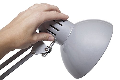 Arm und Leuchtenkopf der Tischlampe sind aus Metall, die Leuchte ist um 360° drehbar und 130° neigbar.