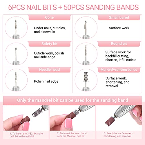 Leistungsstarkes und benutzerfreundliches Nagelfräser Set: Hohe Geschwindigkeit, geringe Vibrationen, geringe Geräusche und reibungsloser Betrieb. Ein Professionelles Nagelpflegegerät mit sechs Schleifkörpern (2.35mm), 56stk Schleifkappen und einer Glasfeile zum Schleifen, Schnitzen, Kürzen, Glätten und Herumlungern von Gel-/Acryl-/Naturnägeln.