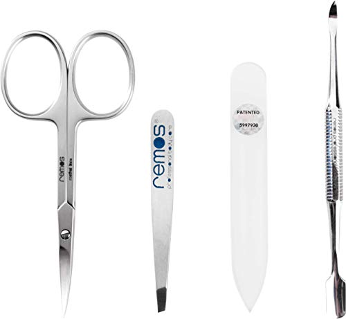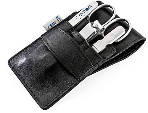 Nageletui „Kore“ – schwarz – 4-teilig bestückt Schönes Geschenk: das Maniküre Set „Kore“ ist in 6 verschiedenen Farben erhältlich und eignet sich ideal als edles Geschenk Qualitätsprodukt: das Maniküreset besteht aus echtem Leder, innen sowie außen, und umfasst hochwertige Instrumente aus rostfreiem Edelstahl für die Maniküre Umfangreich: das Etui ist 4 – teilig mit einer Nagelschere, einer Saphirfeile aus Edelstahl, einem Nagelzwicker und einer Augenbrauenpinzette ausgestattet Farbe: schwarz Größe: 115 x 67 mm. Maniküre Set „Kore“Das Maniküre Set „Kore“ kann 4-teilig bestückt werden und besteht universell aus echtem und sehr hochwertigem Leder. Mit seiner perfekten Größe von 115 x 67 mm eignet sich dieses Etui für den Gebrauch oder die Aufbewahrung zu Hause, Wohl auch für Unterwegs. Das Etui kann einfach und schnell geöffnet oder versperrt werden, in dem die Lasche in eine Schlaufe gesteckt wird. Somit wird auf Reißverschluss oder Druckknopf ganz verzichtet. BestückungBei einem Kauf mit Bestückung, befinden sich folgende Remos Instrumente aus rostfreiem Edelstahl in diesem „Kore“ Etui: Remos Augenbrauen Pinzette abgeschrägt: Die hochwertig verarbeitete Augenbrauenpinzette von Remos besteht aus rostfreiem Edelstahl. Die abgeschrägten Spitzen wurden perfekt aufeinander abgerundet. Sie greifen feinste Härchen problemlos. Mit der Augenbrauen Pinzette können Augenbrauen sehr einfach gezupft und in Form gebracht werden. Wohl auch sonstige Körper- oder Gesichtshaare lassen sich damit abtrennen. Zusätzlich können Splitter, die sich unter der Haut befinden, mit dieser Pinzette von Remos, herausgezogen werden. Beschäftigt man sich gerade nicht mit der Körperpflege, so kann man die 9 cm lange Pinzette auch zum Basteln oder für den Modellbau verwenden. Im Etui befindet sich die Pinzette satiniert in der Farbe Silber. Remos NagelknipserMit diesem Nagelknipser können Finger- und auch Fußnägel einfach und problemlos geschnitten werden. Die gebogenen Absicheln s