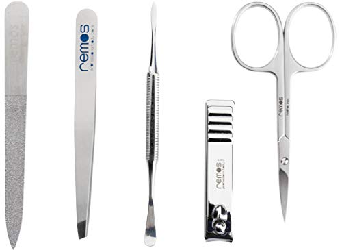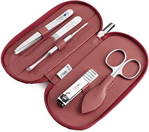 Maniküre Set „Tellus“ – rot – 5-teilig bestückt Schönes Geschenk: das Maniküre Set „Tellus“ ist in 6 verschiedenen Farben erhältlich und eignet sich ideal als Geschenk Höchste Qualität: das Etui besteht aus echtem, hochwertigem Leder (innen und außen) und die bestückten Instrumente aus rostfreiem Edelstahl Bestückt mit: einem Maniküre Instrument zum Zurückstoßen der Nagelhaut und Reinigen unter dem Nagel, einer Nagel- und Hautschere, einer Diamantfeile aus Edelstahl, einem Nagelzwicker und einer Augenbrauenpinzette Farbe: rot Größe: 140 x 70 mm Maniküre Set „Tellus““Tellus“, das Maniküre-Set von Remos besteht innen sowie außen aus echtem und hochwertigem Leder. Das Etui, das 5-teilig mit Remos Körperpflege Instrumenten bestückt werden kann, ist 140 x 70 mm groß. öffnet man das Etui durch den Reißverschluss, so können seine beiden Hälften auseinandergeklappt werden. So liegen alle Instrumente direkt nebeneinander und man hat einen guten überblick über diese. Das Maniküre Set „Tellus“ kann sehr gut zu Hause verwendet werden, um die Maniküre Instrumente bei Nichtgebrauch geschützt aufzubewahren. Dagegen bekannt als im Urlaub ist das Maniküre Set von Remos ein praktisches Utensil. BestückungWird das Maniküre Set „Tellus“ inklusive Bestückung ausgewählt, dann befinden sich folgende Körperpflegeinstrumente von Remos im Etui: Remos DiamantnagelfeileDas Feilenblatt wurde bei der Herstellung auf beiden Seiten mit Diamantkörnern belegt. Eine der Seiten besitzt etwas gröbere, hochwertige Körner, die andere ist spürbar feiner. Durch dieses Material ist die Feile sehr langlebig. Sie kann für Finger- sowie Zehennägel verwendet werden und macht ihre Abhandlung bekannt als bei dicken, harten Nägeln ausgezeichnet. Durch das Abreiben mit der Remos Diamantfeile werden die Nagelkanten automatisch versiegelt und ein Einreißen wird dadurch verhindert. Remos Augenbrauen Pinzette abgeschrägt: Die hochwertige Augenbrauenpinzette von Remos besteht aus rostfreiem Edelstahl. Die exakt aufeinander abges