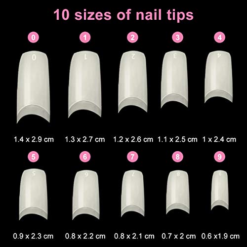 【10 verschiedene Größen】 500 Bruchstück falsche Acrylnagelspitzen mit einem Kartonbehälter aus Antiblockiersystem-Material. 10 verschiedene Größen mit 50 Nagelspitzen jeder Größe, die geteilt mit 0 bis 9 nummeriert sind, sodass die Auswahl der geeigneten Größe einfach und bequem ist. Kein Geruch und kein Gift für Ihre Nägel.