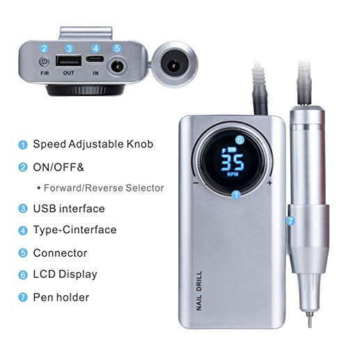 Intelligente LED-Anzeige: Die digitale Anzeige zeigt die Drehzahl, die Leistung und die Drehrichtung (F/R). Dieser Nagelpolierer hat 35 Geschwindigkeitsstufen von 00 bis 35. Der Batterieverbrauch kann jederzeit und überall überwacht werden und die Drehrichtung kann mit einem Knopf gewechselt werden