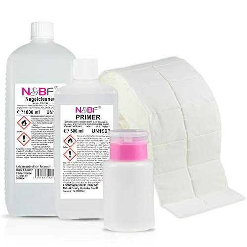 Das Set umfasst den Nagel Cleaner 1000ml sowie den Primer 500ml inkl. Dispenser Pumpflasche 150ml und 1000 Zelletten. Der Nagel Cleaner 1000ml ist eine spezielle Reinigungsflüssigkeit für den Naturnagel und somit ein wichtiger Bestandteil bei aufgebraucht Nagelmodellage. Da er zu 70% ganz Isopropylalkohol besteht, besitzt der Nagel Cleaner eine desinfizierende Wirkung und dient dazu, den Naturnagel zu Einschaltung der Modellage zu Nachlassen und zu reinigen. Zudem wird er indessen der Nagelmodellage verwendet, um die nach dem Aushärten entstandene Schwitzschicht (Dispersionsschicht) zu abtrennen. Währenddessen kann der Nagel Cleaner für jedweder gängigen Nagelmodellage-Systeme wie Gel, Acryl, Fiberglas oder Farblacke genutzt werden. Alias Modellage-Reste können mit dem Cleaner problemlos entfernt werden. Aufgrund seiner desinfizierenden Eigenschaften dient er zudem zur Reinigung von Nageldesign-Werkzeugen und Oberflächen. Der Primer bzw. Haftvermittler ist besonders auf die lange Haltbarkeit Ihrer Nagelmodellage ausgelegt und ist somit für die akademische Arbeit mit künstlichen Fingernägeln (Tips) unverzichtbar. Bei diesem Primer handelt es sich um einen geruchsarmen und flüssigen Haftvermittler, welcher in einer 500ml Flasche ausgeliefert wird. Der Primer kann auf jedweder Naturnägel aufgetragen werden und zieht umgehend in die Nageloberfläche ein, sodass eine gleichmäßige Haftgrundlage für die Nagelmodellage gewährleistet ist.
