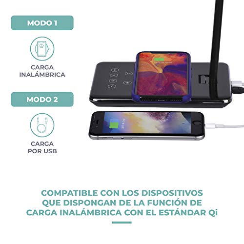 Qi WIRELESS CHARGER und USB PORT: Flexo-LED mit doppelter Ladefunktion. Beleuchten Sie Ihren Arbeits- oder Lernbereich und laden Sie gleichzeitig Ihr kompatibles Qi-Handy auf. Wenn Sie möchten, können Sie Ihr Mobilgerät auch aufladen, indem Sie es an den USB-Anschluss unserer LED-Schreibtischlampe anschließen.