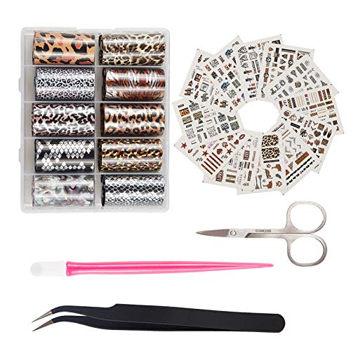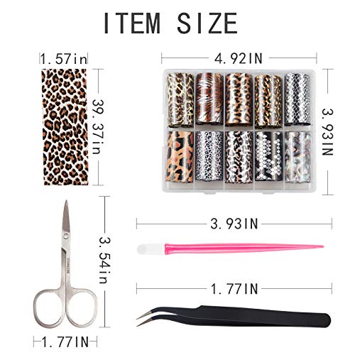 NICENEEDED 10 Farben Nagelfolie Transfer Aufkleber und 12PCS Nail Art Aufkleber Abziehbilder mit Leopard Nagelspitzen Wraps Folie Transfer Klebstoff Acryl DIY Nageldekoration