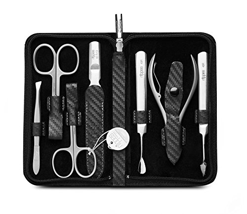 INHALT: 1 nippes solingen maniküreset karbon, etui jedweder rindleder, hautschere, nagelschere, saphirfeile, pinzette, reiniger, nagelzange, edelstahl rost- unter anderem nickelfrei, farbe: schwarz, gewicht: 218 g, art.-nr.: 1006