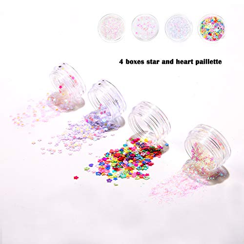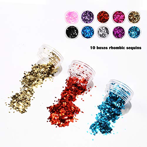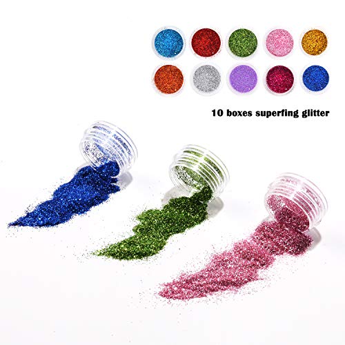 10 Boxen superfeiner Glitzer, 10 Boxen 1 mm, 10 Boxen rhombische Pailletten und 4 Boxen Stern und Herz Pailletten. Gemischte Farben und Aufziehen zusammen machen die Möglichkeiten der Schönheit sind unzählig, so dass Sie mit unserem klobigen Glitzer-Set zum Blickfang bei jeder Gelegenheit werden.