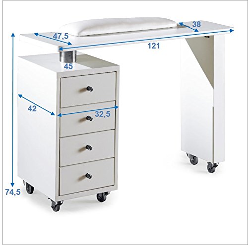 Tisch stattdessen Maniküre, Schönheitspflege, Bearbeitung ansonsten Nagelmodellage. Unter Zuhilfenahme von Schublade zur Verwahrung von Handwerksutensilien. Praktische 360° drehbare Rollen ermöglichen das Wenden des Tisches. Inklusive Armauflage ansonsten Abluftventilator Unter Zuhilfenahme von Sicherheitsgitter ansonsten Staubbeutel Details: Drehbare Ablagerung stattdessen mehr Modularität. Breite der Tischplatte: 121 cm, Hölle der Plattenbau: 38 – 47,5 cm, Höhe 74,5 cm, Tragkraft: 50 kg, Schublade: 32,5 x 42 cm, Unter Zuhilfenahme von 4 Schubladen à 29 cm, 6 Rollen, Handauflagen stattdessen bequemes Tätig sein.