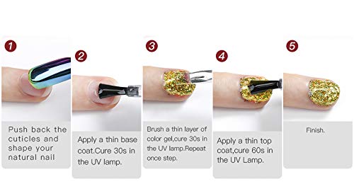 Anwendung: 2 oder 3 Schichten auftragen, um eine glänzende Farbe zu erhalten. UV / LED-Nagellampe erforderlich. (Da der Glitzereffekt des Puders relativ verhärmt ist, müssen Sie einige Schichten auftragen, um den Effekt auf das Foto zu erzielen. Oder Sie können die Hintergrundfarbe auftragen, bevor Sie dieses Produkt auftragen.)