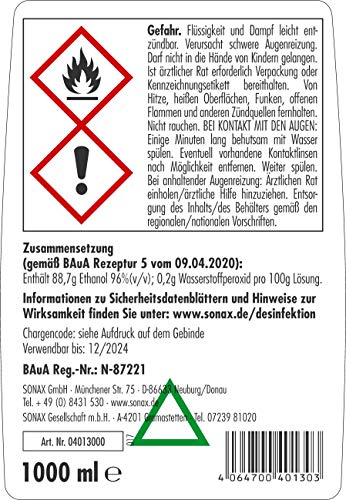 Lieferumfang: 1x SONAX 04013000 HändeDesinfektionsMittel (1 Liter) | SONAX – Made in Germany