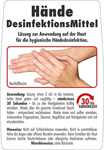 Anwendung: Ablösung (etwa 3 ml) in die trockene, hohle Hand geben – mindestens 30 Sekunden – bis zu den Handgelenken kräftig einreiben. Hände über die gesamte Einwirkzeit feucht halten – entsprechend nachdosieren. Hände innen und außen einreiben, insbesondere Fingerspitzen, Daumen, Nagelfalze und Handgelenke sind mit einzubeziehen