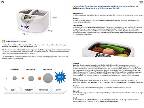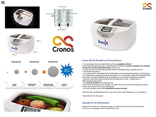 【 CRONOS SONIX 2.5 L ULTRASCHALLREINIGER 】 Tankmaterial: Antiblockiersystem, AS, Edelstahl (SUS304) // Kapazität: 2.5 l // Anzeige: LED // Betriebszeit: 1-30 Minuten einstellbar mit Tasten // Stromversorgung: 220 ~ 240 V, 50/60 Hz // Ultraschallfrequenz: 45 kHz // Leistung: 60W.