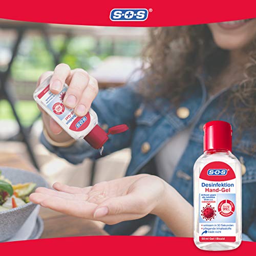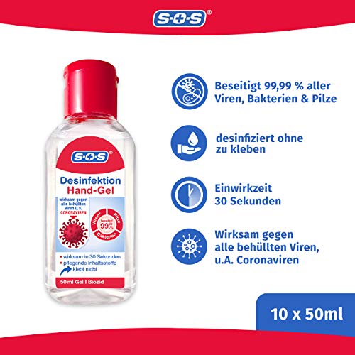 SOS Desinfektion Hand-Gel, 10 x 50 ml Flasche, Handdesinfektion gegen 99,99% der Bakterien, Pilze und Viren* in 30 Sekunden ohne Verkleben, Desinfektionsmittel für unterwegs