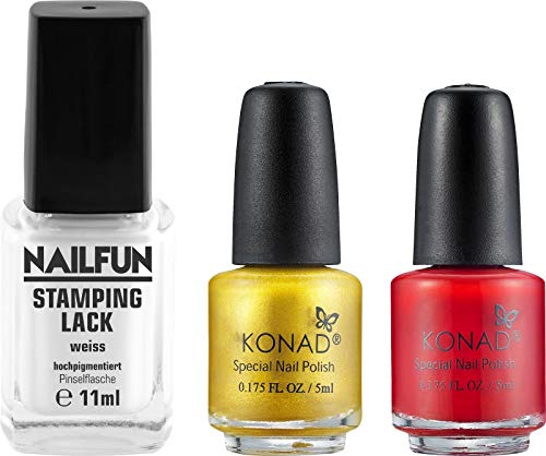 Es besteht sämtliche: 1x Clear Jellystamper + 1x NAILFUN Stamping-Lack weiss 11ml + 1x KONAD Stamping-Lack rot 5ml + 1x KONAD Stamping-Lack gold 5 ml jeweils in der schönen Glas-Pinselflasche