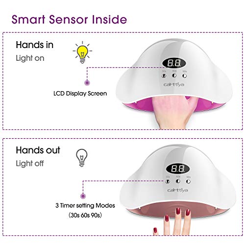 💅AUTO SENSOR & 3 TIMER & LCD-ANZEIGE: Carttiya led lampe nägel ist mit einem Infrarotsensor ausgestattet, sodass Sie ungeachtet Ihre Hand hinein- oder herausziehen müssen und die Nagellampe sich automatisch ein- oder ausschaltet. Sie können die Zeit von 30s, 60s, 90s nach Ihren Wünschen einstellen. Drücken Sie einfach die Taste, um die Illustration zu aktivieren.