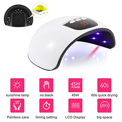 【Hochleistungs-Nagellampe】 Die 45-W-UV-LED-Lampe verfügt über 18-teilige Hochleistungs-LED-Leuchten mit 3 Timer-Einstellungen für 30s / 60s / 90s, gleichmäßiges Backen, nicht schrumpfend, abgrundtief in der inneren Schicht, haltbarer, schnell härtet alle Arten von UV-Strahlen aus LED-Gel-Nagellack, Basis-Gel-Decklack und Poly-Gel-Nagelverlängerungskit.
