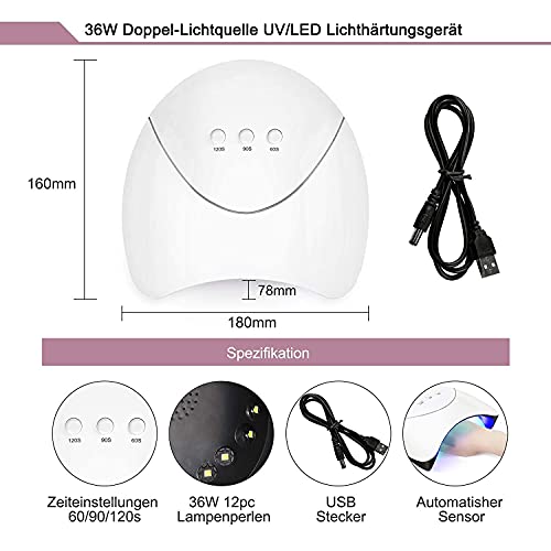 36W NAGEL LAMPE: 36W Abschrift-Lichtquelle Auto-Sensor Nagellampe mit 12 LED UV-Perlen, 3 Timer-Einstellungen(60/90/120s) und USB-Anschluß lassen sich Ihre Nagelgele so schnell wie möglich frottieren.