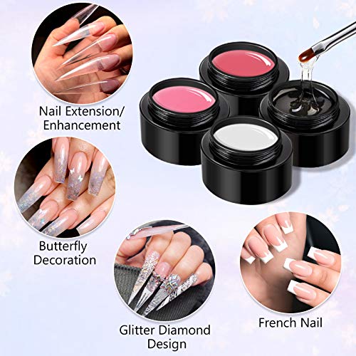 ❤ 【PROFESSIONAL BUILDER NAIL GELS NAGELKIT】 Dieses gut verpackte Builder-Gel-Kit enthält 4 Builder-Gele in Hochglanzfarben (klar, weiß, pink, nacktrosa), 100-teilige Nagelformen und Nagelbürste. Das Builder-Gel-Set kann Ihre Fingerspitzen modischer und schicker machen. Ideal für eine DIY-Maniküre oder einen Nagelstudio!