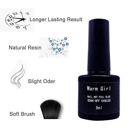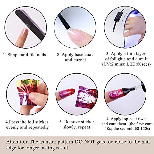 LED-/UV-Lampe erforderlich: Transferfolienkleber sollte unter einer LED/UV-Nagellampe für ein perfektes Folienergebnis ausgehärtet werden (UV-Lampe für 1–2 Minuten; LED-Lampe für 40–60 Sekunden). Unser Nagelkunst-Kleber mit starker Haftung, die Verwendung mit strapazierfähigem Decklack kann das Folien-Finitum im täglichen Leben verlängern