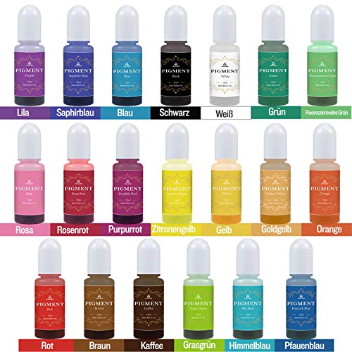 20 SORTIERTE FARBEN: Es gibt eine Diversität von 20 Farben Epoxidharz Farbe, die gemischt werden können, um Ihre eigenen benutzerdefinierten Farben zu erzielen. Jede Flasche ist 10 ml / pro, 0,35 Unzen. Epoxidharz Farbe sind Schwarz, Rosenrot, Himmelblau, Purpurrot, Pfauenblau, Kaffee, Rot, Fluoreszierendes Grün, Zitronengelb, Saphirblau, Weiß, Braun, Grün, Goldgelb, Orange, Lila, Trunken, Grasgrün, Gelb, Rosa;